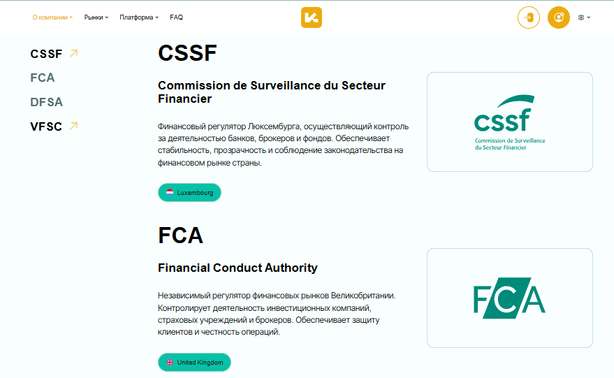 Что касается лицензий и регулирования, то владельцы утверждают, что деятельность платформы контролирует сразу 4 мировых регулятора: FCA, DFSA, CSSF и VFSC. Они даже дают ссылки на страницу компании на сайтах этих органов.