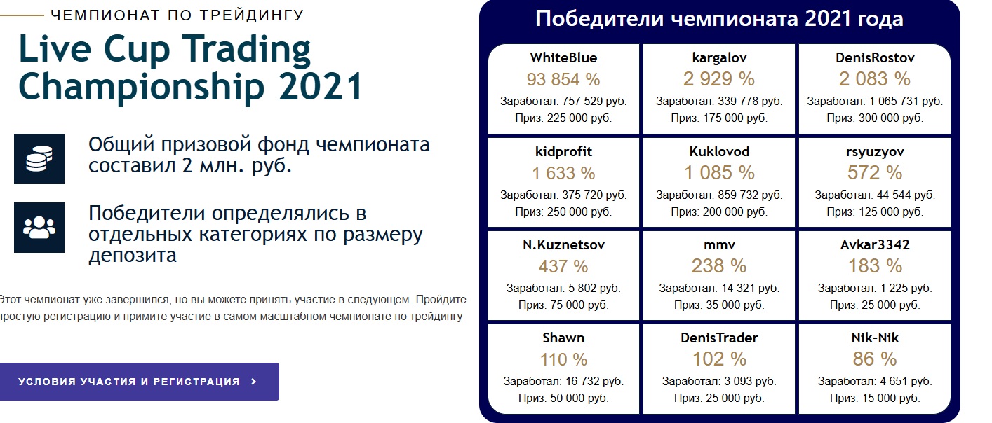 В профиле трейдера есть сведения о том, что он является победителем Чемпионата ФБТР по трейдингу, проводимого в 2021 году. Однако при проверке официального сайта данного мероприятия стало известно о недостоверности этих данных.