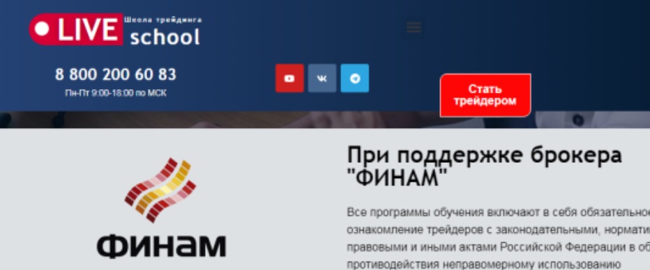 Помимо этого сомнения вызывает заявление о партнерстве с крупной брокерской площадкой «Финам». В процессе поиска признаков сотрудничества школы с данной компанией нам не удалось найти ни одного факта, который хоть как-то подтверждал бы эту связь.