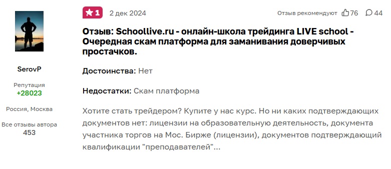 Что же касается онлайн-школы, в которой преподает данный персонаж, то отзывы о ней сплошь негативные. А один из очевидцев написал целое разоблачение, затрагивающие сразу несколько аспектов обучения. По его словам, данная организация не имеет юридических оснований на ведение образовательной деятельности. Также пострадавший утверждает, что содержание обучающих материалов не внушает доверия, ведь оно попросту скопировано из открытого доступа.