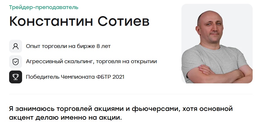 Константин Сотиев – специалист в области трейдинга акциями и фьючерсами. Работает на системе агрессивного скальпинга и торгов на открытии. Также основал курсы по инвестициям и торговле на финансовых рынках. Многие пользователи крайне недовольны качеством услуг. Является ли данный персонаж очередным инфоцыганом – выясним в настоящей статье.