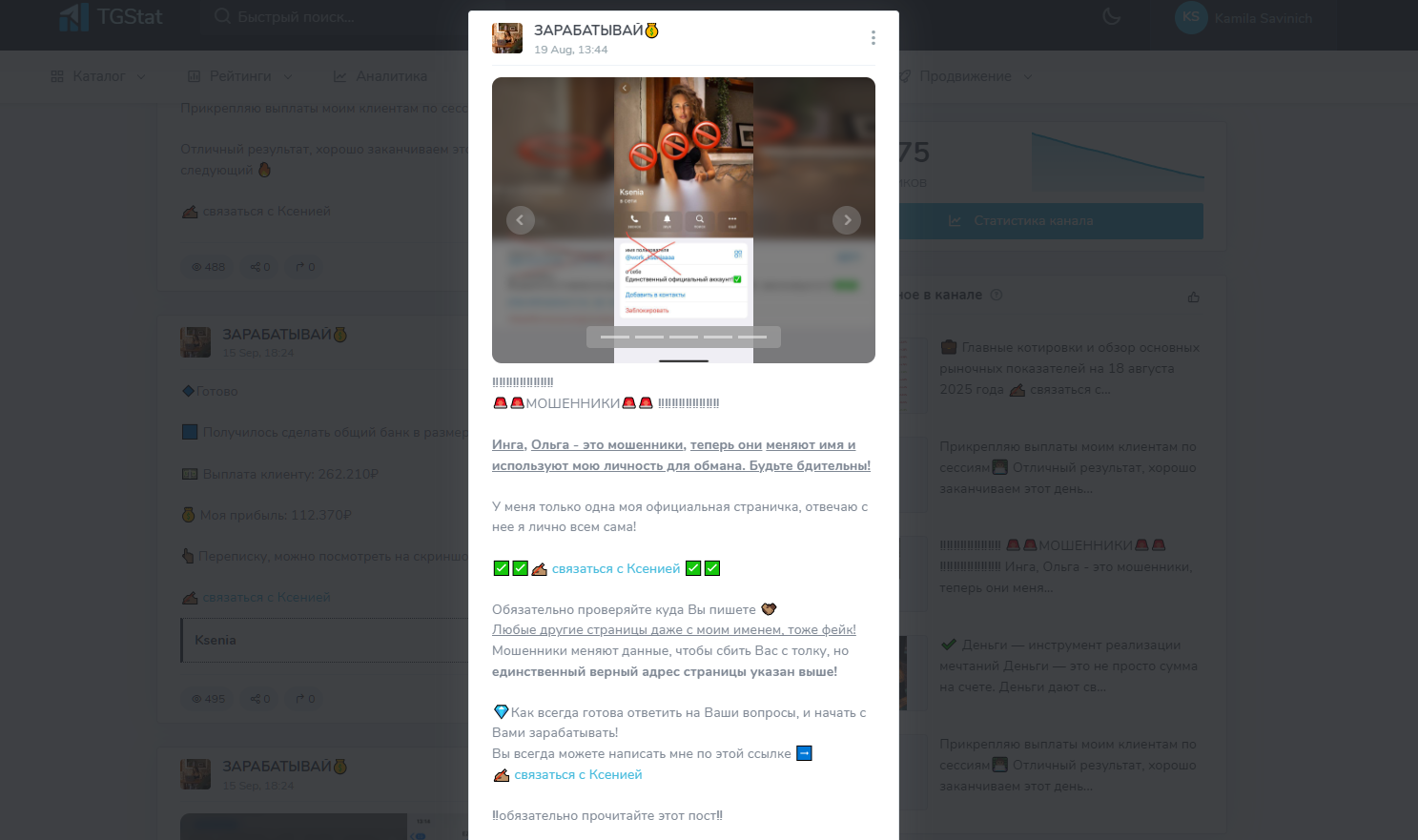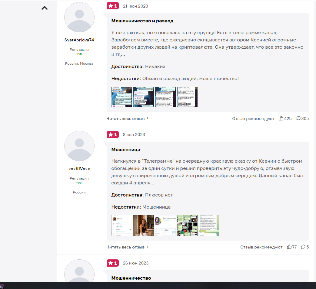 Аферистка имеет наглость заявлять, что от имени ТГ канала Ксения «Зарабатывай» отзывы пишут мошенники. Якобы от имени честнейшей девушки аферисты стараются обмануть пользователей. Но только она гарантирует стабильный и большой финансовый базовый доход.