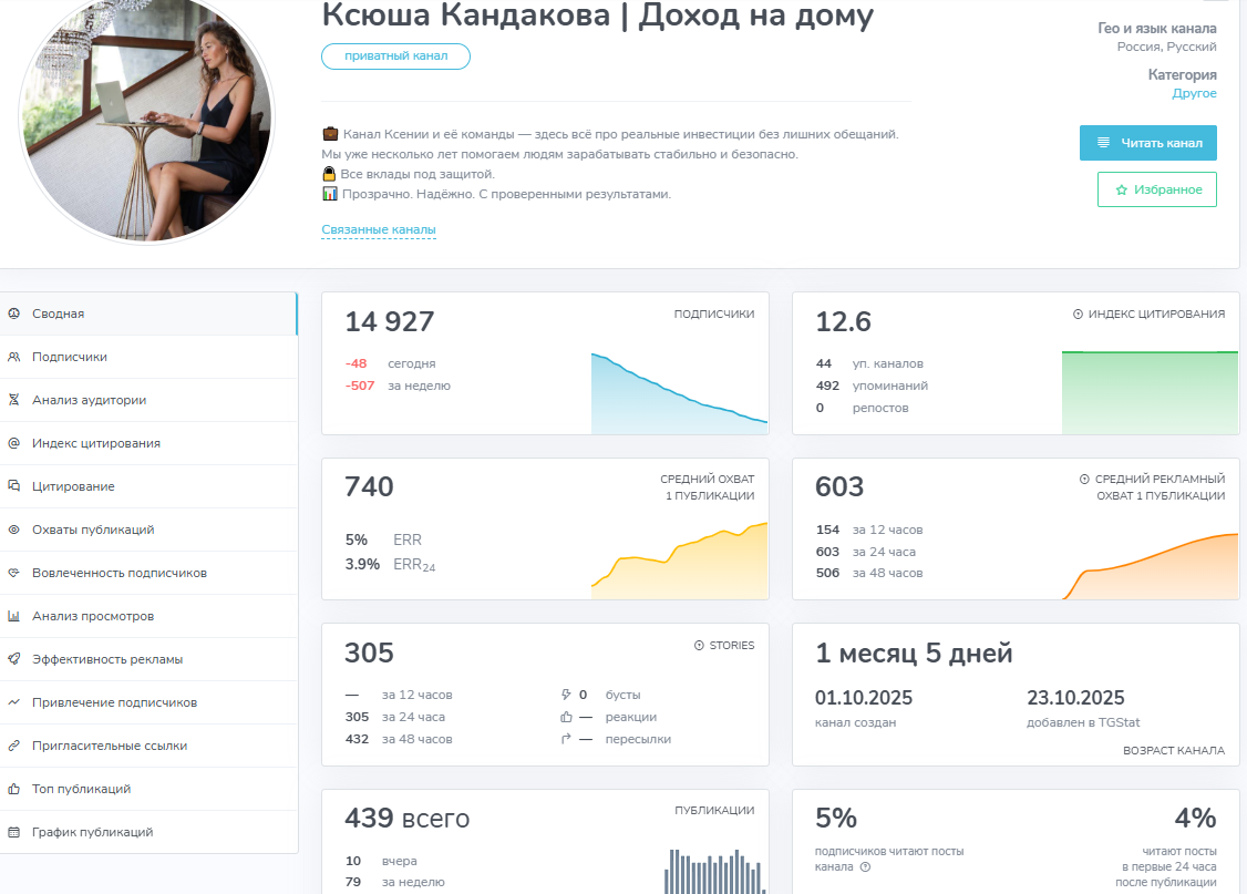 Сразу отметим, что данный канал в Телеграмм на ноябрь 2025 изменил название и теперь это «Ксюша Кандакова | Доход на дому», но мы также будем использовать в статье и старое название. Ресурс закрытый, но по данным TGStat видно всю базовую информацию. Запущен он 1 октября 2025 с целью предложить всем желающим совместный трейдинг криптовалютой.