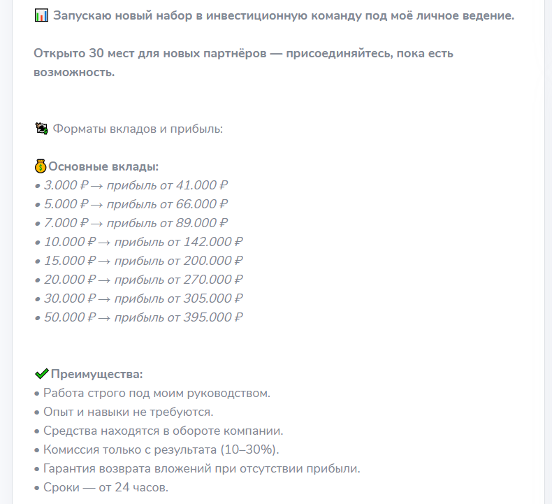 • минимальное вложение ₽3,000 и ожидаемая прибыль с него не менее ₽41,000;