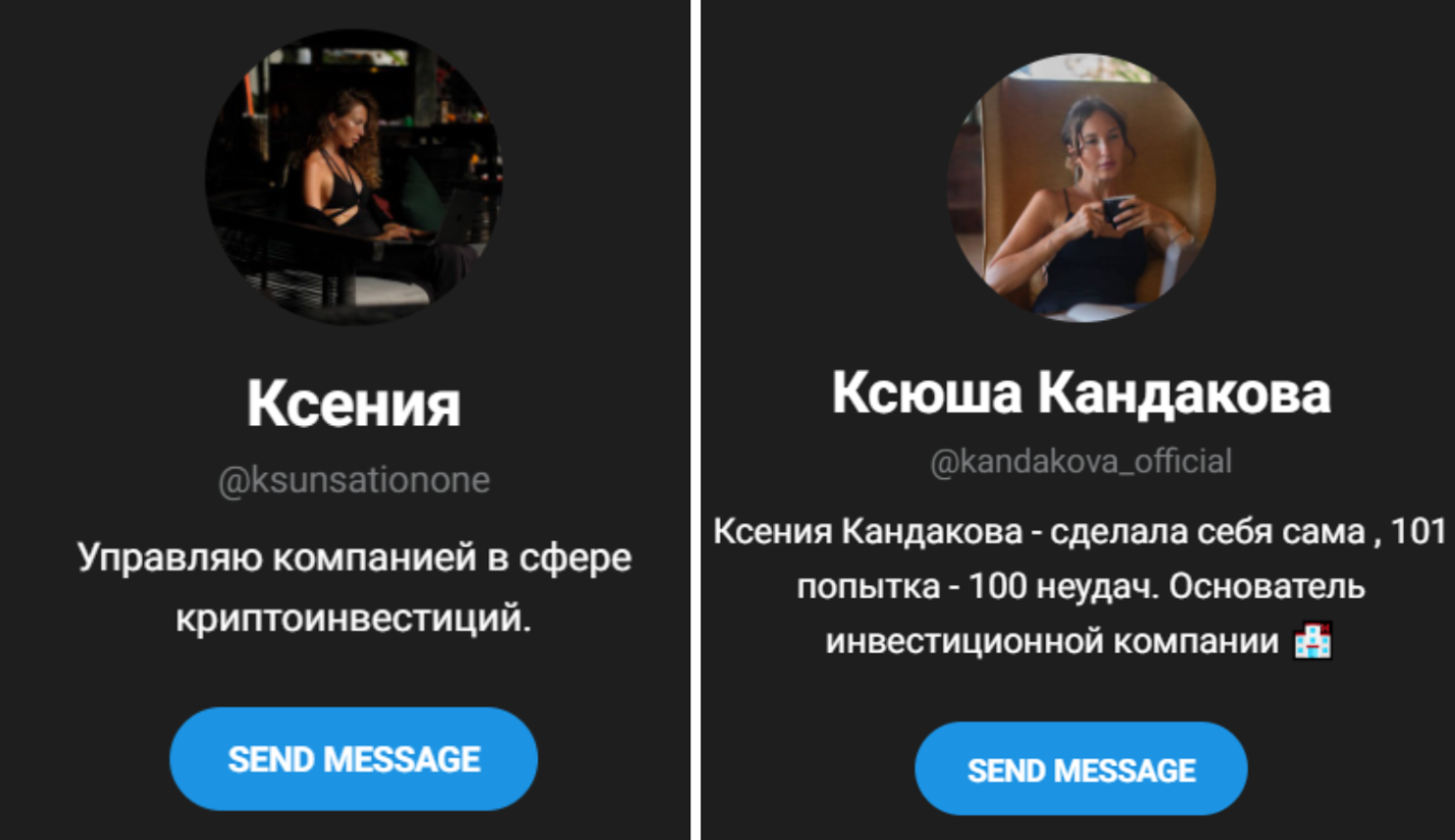 Автор, Ксюша, не публикует своей биографии, а просто заявляет, что является крайне успешным профессиональным трейдером и умеет зарабатывать на крипте. Для связи использует аккаунты в Телеграмм Ksunsationone, Kandakova Official, а также другие профили.