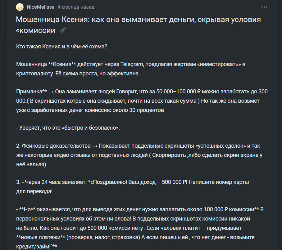 На некоторых форумах конкретно расписывают всю систему, по которой работает ТГ канал «Ксения Кандакова | Доход на дому» и говорят, что это скам, а вместо обещанного заработка на криптовалюте клиенты Ксюши попадают на развод. Говорят, что сначала на проекте заманивают красивыми обещаниями, уверяют, что все будет быстро и безопасно, но через время сообщают, что забрать прибыль можно только после оплаты комиссии или налога. Когда клиент отказывается платить, его блокируют.