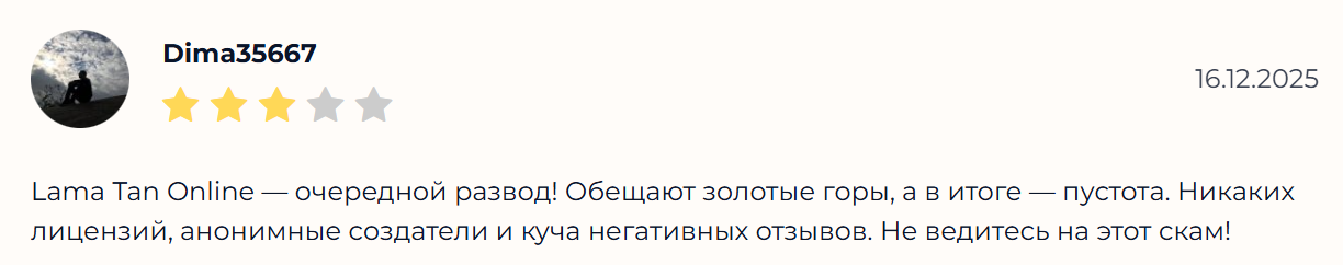 Мы провели анализ работу брокера, изучили опубликованную информацию на сайте Lama tan online, отзывы о нем, торговые условия, наличие регистрации и прочие сведения. Результаты проверки показывают ряд признаков скама. Среди них выделяются: