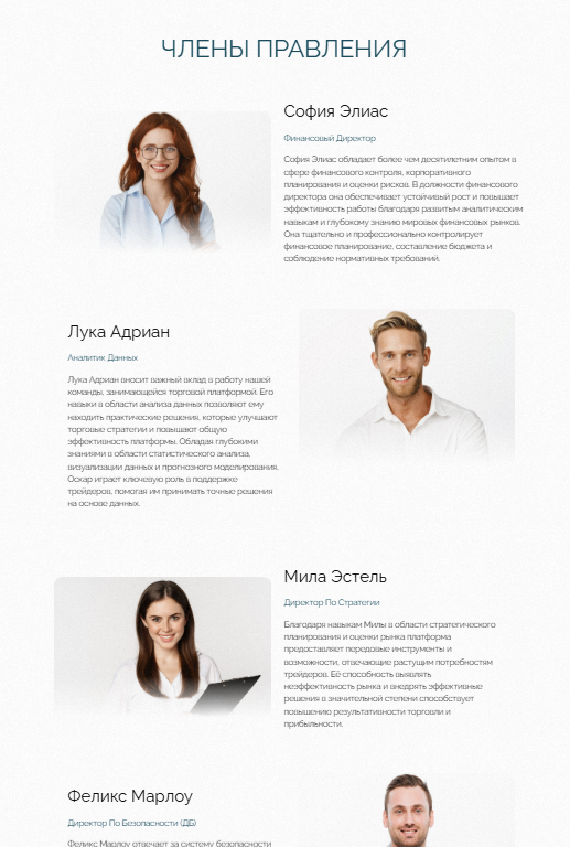 На сайте представлены члены правления. Однако чем дальше разработчики углубляются в ложь, тем очевиднее она становится.