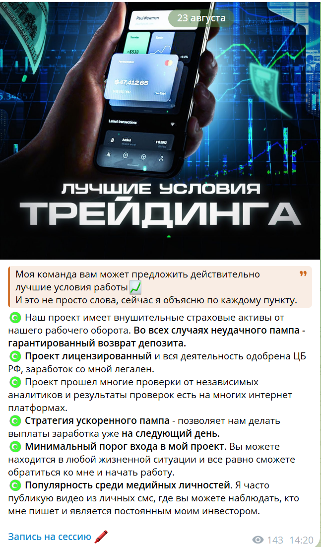 Стратегия пампа и дампа запрещена на многих финансовых рынках. Обещания минимизации рисков и 100% возврата депозитов нереалистичны. Страхование требует прозрачного фонда, о котором нет данных. Упоминания о лицензии ФИНАМ, регистрации на «Госуслугах» и одобрении ЦБ РФ не подтверждены. Истории успеха клиентов не подкреплены данными, а публикации в СМИ не выглядят как статьи в официальных изданиях.