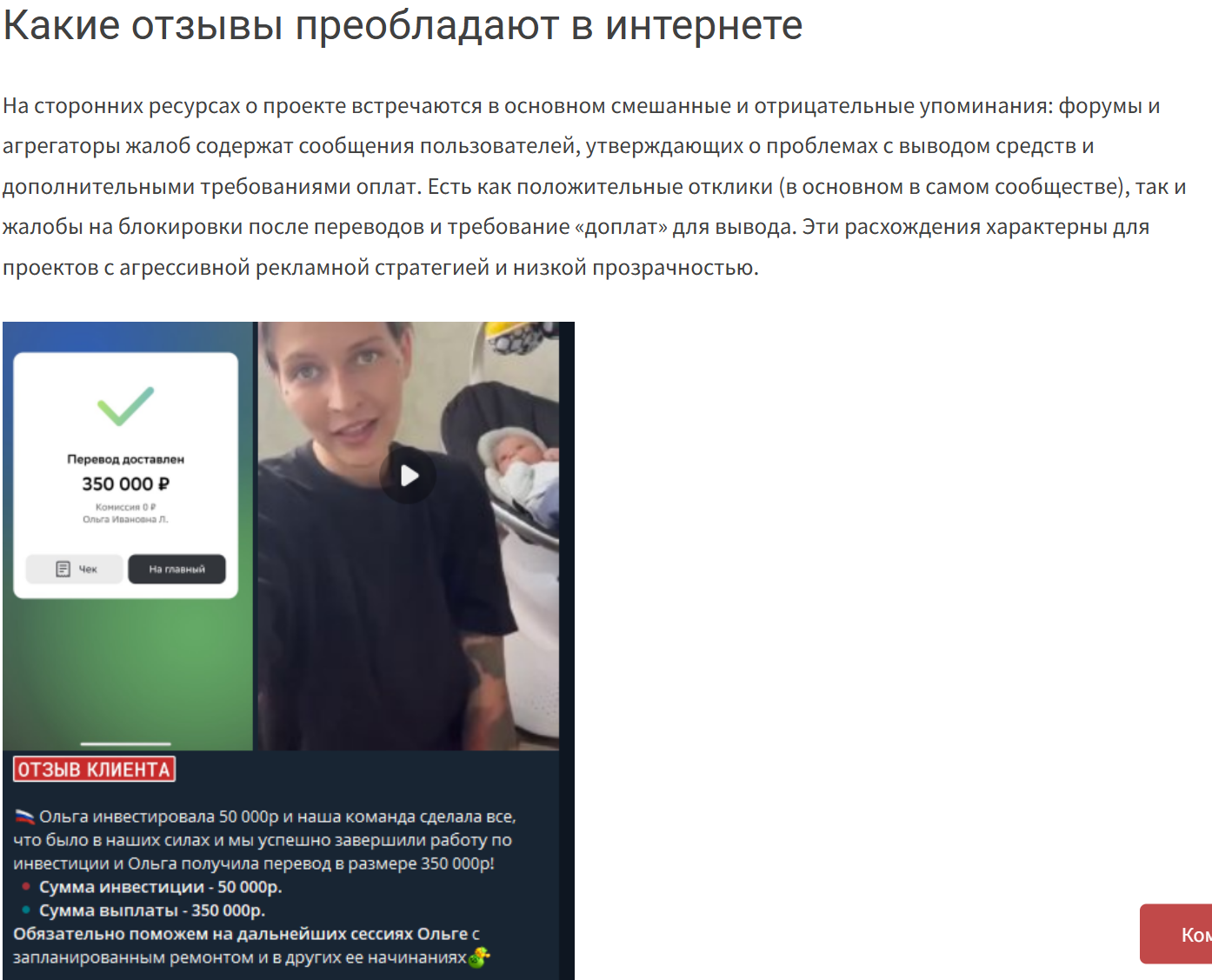 Эти материалы указывают, что достаточное количество пользователей уже было обмануто. Сообщалось о потере средств после внесения депозитов, которые не состоялись, и отсутствии информации о результатах инвестиций. Заявления инвестора о наличии лицензий являются фейковыми. Проект использует манипуляции, такие как ограниченные «места» на сессии и эмоциональные истории успеха, чтобы заманить новых клиентов. Но реальные случаи возврата средств или успешных выплат не подтверждены. Отсутствие отзывов в сочетании с появлением подобных статей усиливает подозрения.