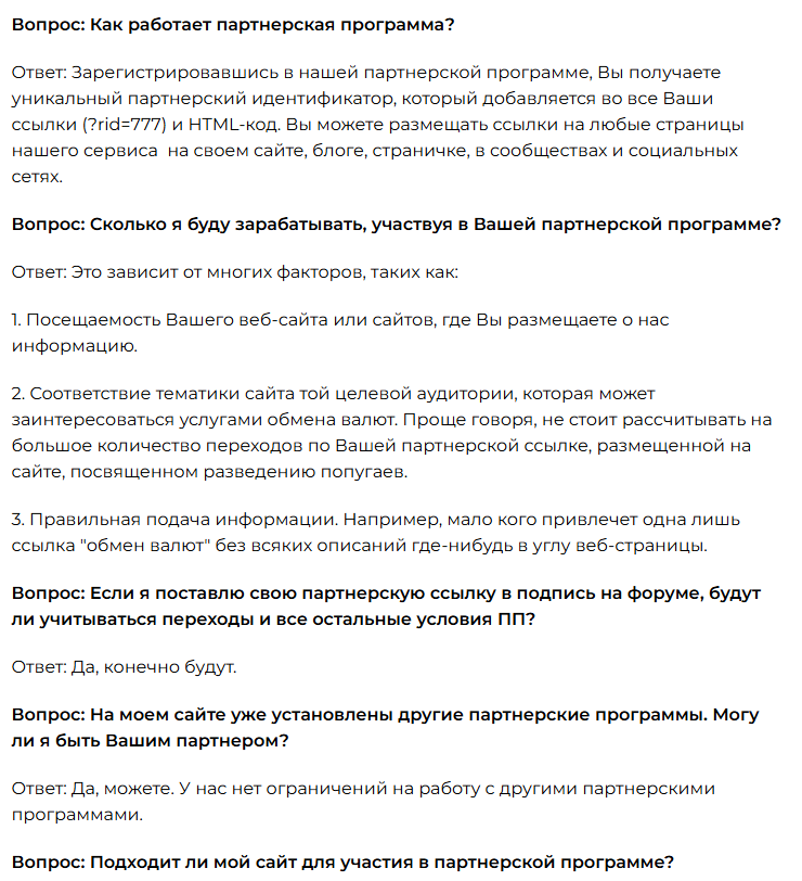 Также на сайте есть раздел F.A.Q., но выглядит он необычно – все вопросы в нем посвящены партнерской программе. Создается впечатление, что основной деятельностью LordChange является не обмен валюты, а привлечение новых партнеров.