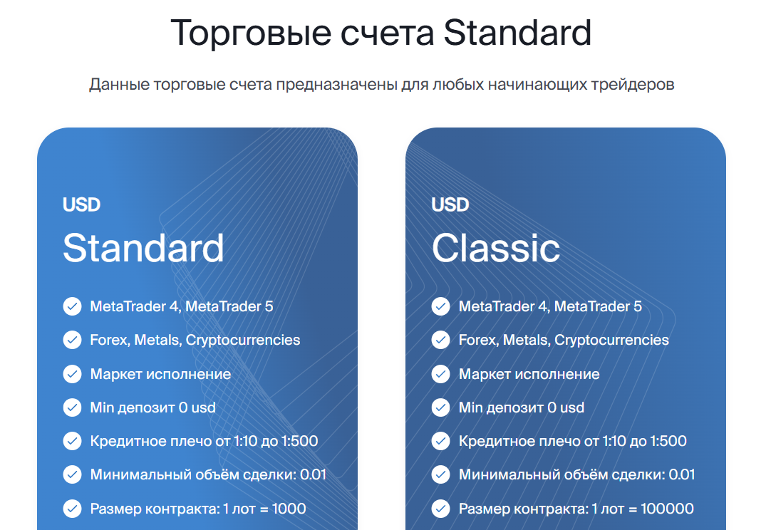 - Standart – ориентирован на новичков, кредитное плечо до 1:1000, отсутствие свопов, комиссия 10 долларов за лот;