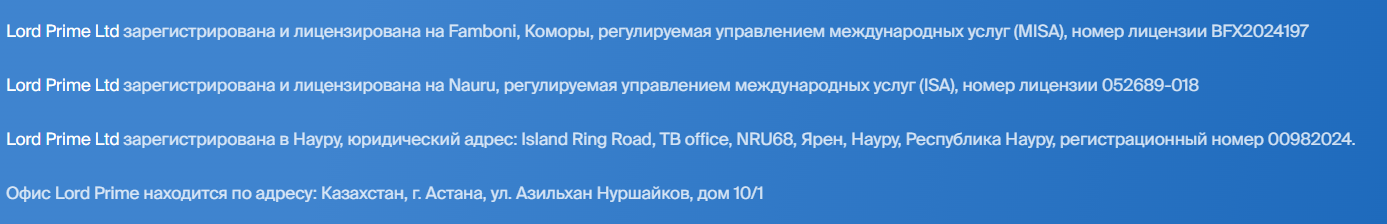 Брокер «Лордпрайм» указывает наличие лицензий. Проверка показывает, что по обозначенным номерам зарегистрирована компания Lord prime ltd. Она может быть не связанной с рассматриваемой организацией. Такие решения нередко применяются мошенниками, так как создается впечатление легальности деятельности. Указано наличие трех регуляторов, но реальная принадлежность к ним вызывает сомнение.