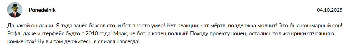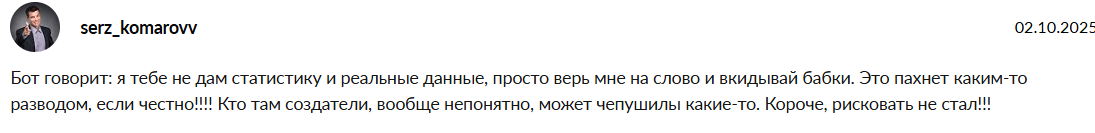 Некоторые люди не пользуются ботом потому что считают, что проект представляет собой развод. Предупреждают не рисковать из-за сомнительных данных обменника.