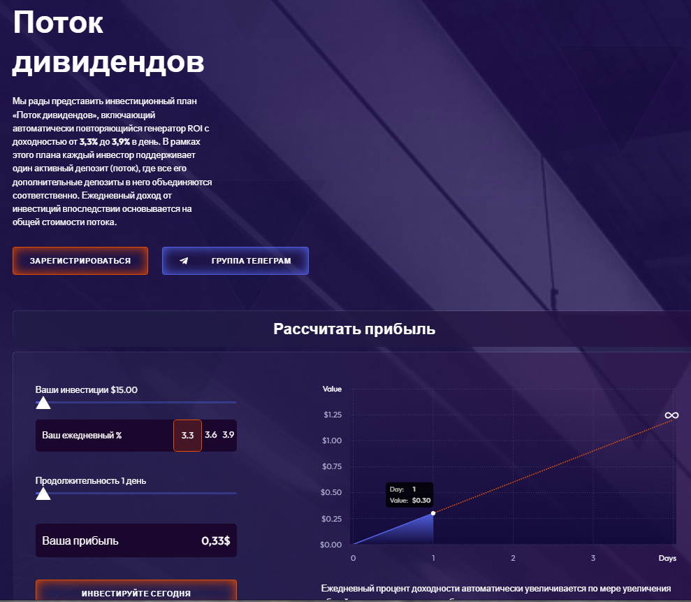 Главной особенностью проекта для заработка выступает функция «Поток дивидендов». С помощью инвестиционного плана можно получать обещанные 3,3-3,9 % прибыли ежедневно.