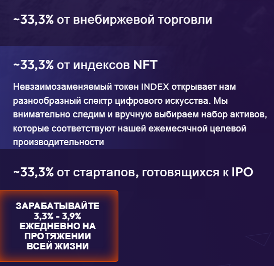 Владельцы сервиса предлагают клиентам зарабатывать 33,3% от внебиржевой торговли, индексов «НФТ» и стартапов, готовящихся к «ИПО».