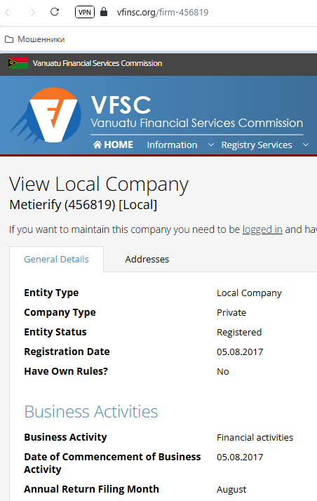 При проверке лицензий мы выяснили, что ссылки ведут не на сайты регуляторов, а на поддельные порталы. Например, вместо официального vfsc vu указан фейковый домен vfinsc org. Скорее всего, представители брокера сознательно вводят пользователей в заблуждение.