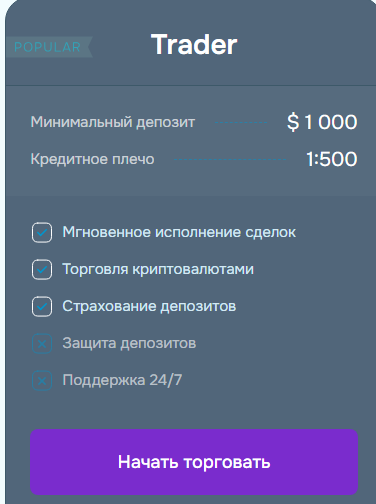 - Trader, обозначенный на сайте как наиболее популярный, требует уже $1,000 минимального депозита и предоставляет кредитное плечо 1:500. В рамках пакета доступны торговля криптовалютами, страхование депозитов, мгновенное исполнение сделок и поддержка 24/7.