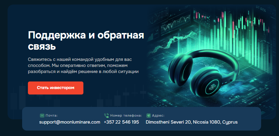 Также пользователь может написать на почту support@moonluminare com или позвонить по номеру +357 22 546 195, но ни там, ни там клиент не получит желаемого ответа. Дело в том, что по телефону дозвониться невозможно, так как звонок автоматически сбрасывается, а электронный адрес и вовсе не существует.