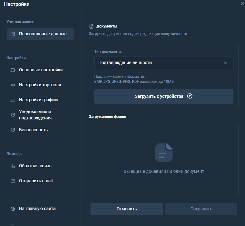 После регистрации трейдер попадает в личный кабинет, где можно настроить аккаунт и пройти процедуру верификации. Для этого потребуется предоставить скан паспорта, а также сотрудники поддержки могут лично связаться с клиентом для подтверждения личности.