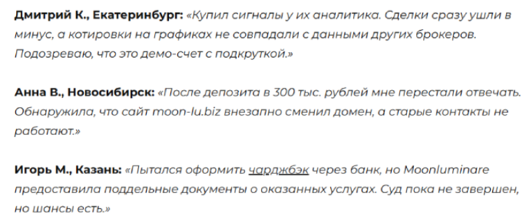 • О компании MoonLuminare есть негативные отзывы в сети, что говорит о плохом опыте клиентов.