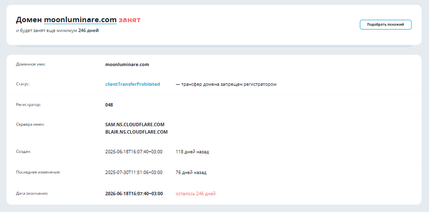 Домен moonluminare com зарегистрировали в середине лета 2025 года, он работает в течение 118 дней, на момент подготовки этого материала. При этом в сети нет сведений о том, кому принадлежит адрес, так как вся информация скрыта маской приватности.