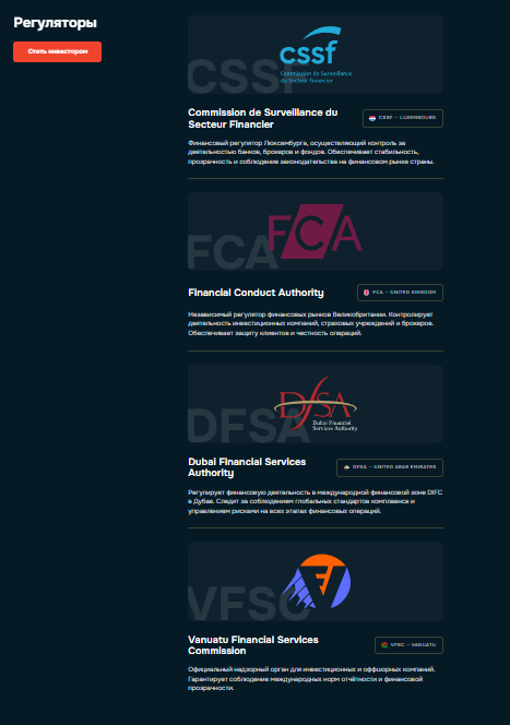 На сайте проекта сказано, что компания работает в разных юрисдикциях и получила лицензии 4 регуляторов, в том числе в строгих зонах Великобритании и Дубая. В разделах представлены ссылки на выписки, якобы позволяющие проверить подлинность сертификатов на сайте надзорных органов.