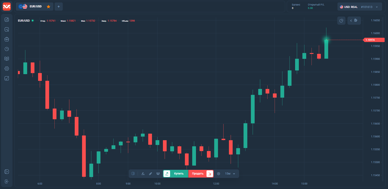 В левой части экрана находится меню для навигации, а внизу торговые элементы для заключения сделок, предполагающих рост или падение активов.