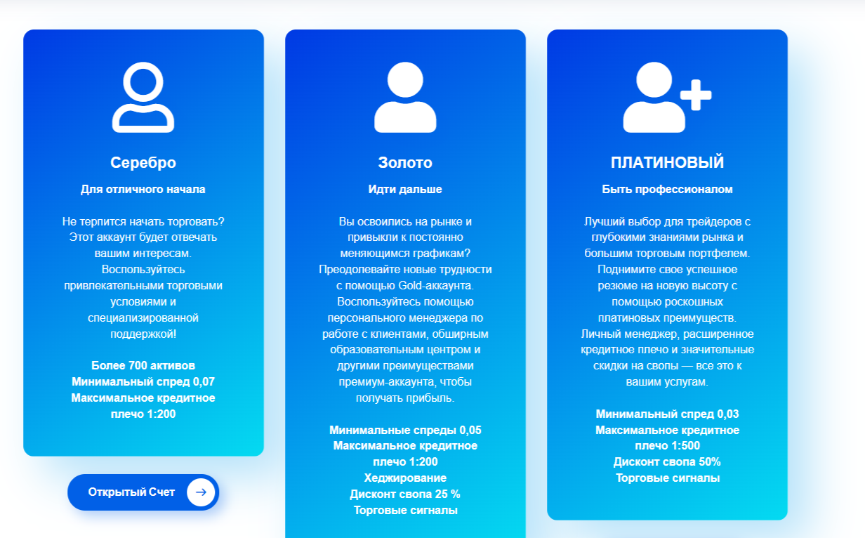- Счет Silver предоставляет доступ к более чем 700 активам с минимальным спредом от 0,07 пункта и кредитным плечом до 1:200 без дополнительных скидок на свопы.