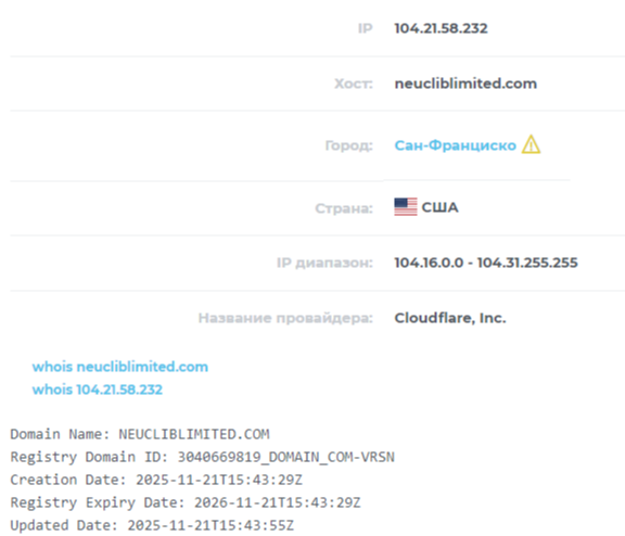 Юридической документации на сайте нет. Это может свидетельствовать о нелегальной работе платформы «НеуклибЛимитед». В характеристиках домена указывается, что запущен он был 21 ноября 2025 года со сроком работы – 1 год. Такой момент показывает несерьезные намерения авторов на данную фирму.