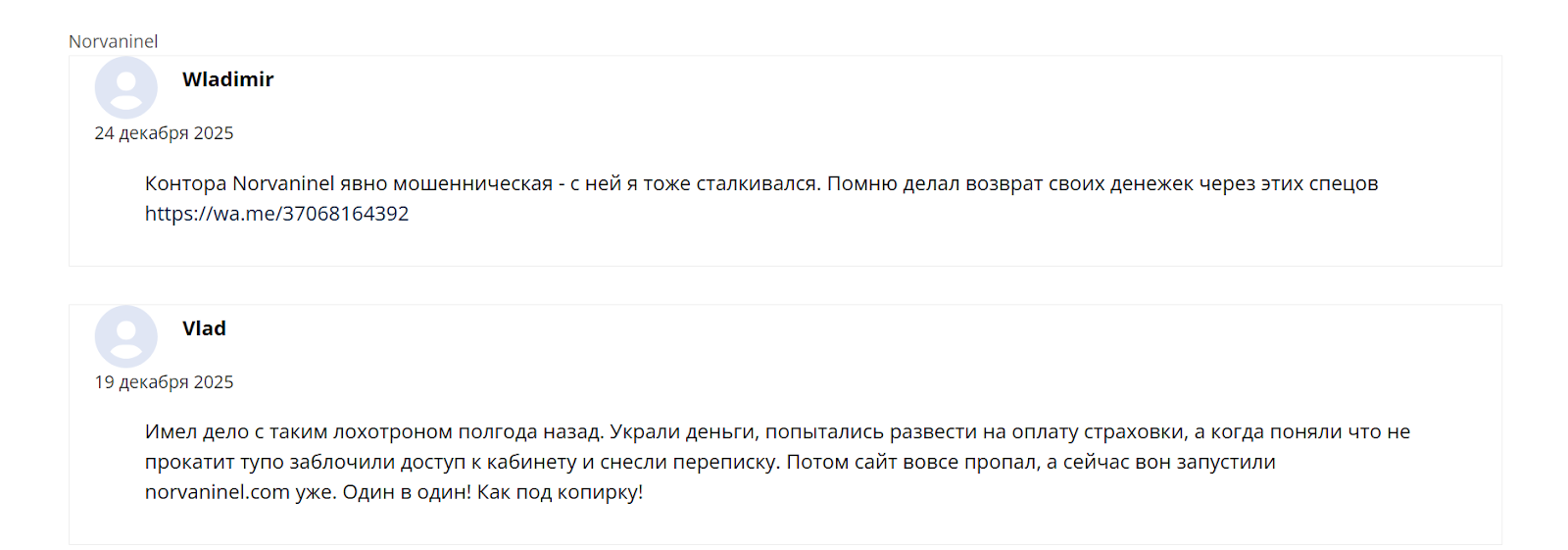 Начали появляться статьи о Norvaninel на специальных ресурсах, где компанию называют мошеннической. Реальная регуляция проекта отсутствует, несмотря на упоминания лицензий. Подтверждающих документов или записей в официальных реестрах этих органов нет.