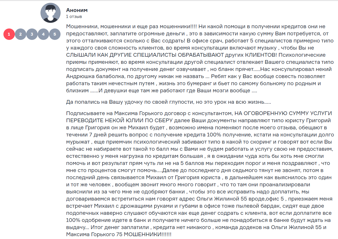 В сети много негативных отзывов о конторе. Мы даже нашли развернутую жалобу, в которой расписана вся схема обмана. Клиента, который мечтал, но не мог оформить кредит, кидали от специалиста к специалисту. Те обещали, что сделают так, чтобы банк оформил займ. Отчаявшимися людьми успешно манипулировали, обещая, что каждая новая переведенная на счет компании сумма – последний шанс получения желаемого. В итоге клиент оставался и без денег, и без одобрения банка.