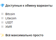 У Obmen60 bot нам удалось найти отдельные условия работы, которые, впрочем, не подтвердили отзывы пользователей. Для обмена клиенты могут использовать BTC, LTC, USDT, а также XMR.