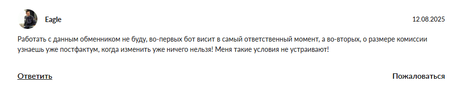 Eagle в отзыве об Obmen60 bot считает проект если не разводом, то некачественным, с постоянными техническими проблемами. Условия обслуживания пользователя не устроили.