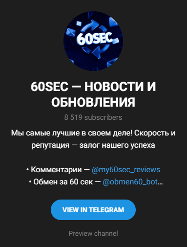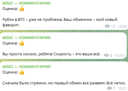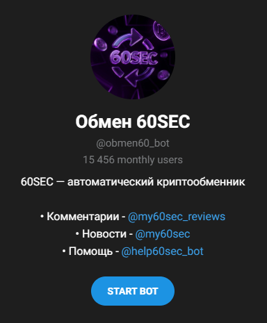 Ботом-обменником криптовалют «60сек» ежемесячно пользуется 15 456. Клиентам доступен отдельный канал «60Sec – Комментарии» с ником My60Sec Reviews, где можно оставлять свои оценки сервиса.