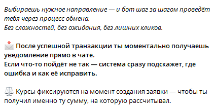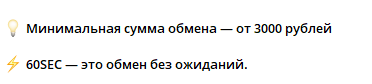 На момент оформления заявки автоматически фиксируются курсы валют, чтобы клиенты могли получать ожидаемую сумму. Минимальная сумма для обмена – ₽3,000 с мгновенным зачислением.