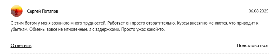 Сергей Потапов отметил массу технических проблем при использовании бота, обмены вовсе не мгновенные, как обещали разработчики.