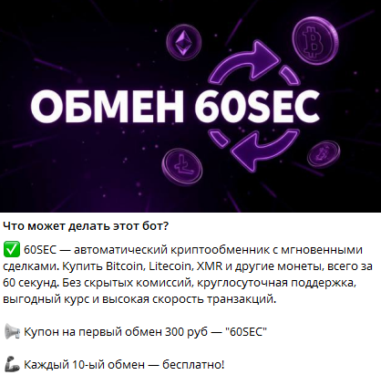 Обзор автоматического обменника криптовалют «60сек»: отзывы клиентов, функционал Obmen60 bot, условия работы и особенности платформы My60sec