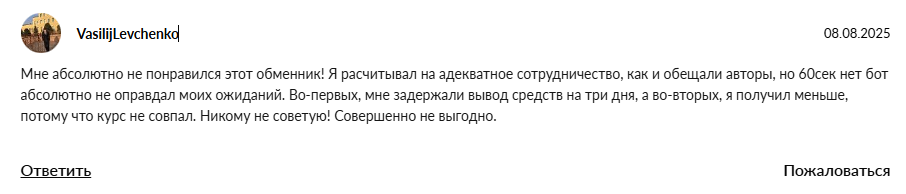 Наша команда не рекомендует вкладывать деньги в автоматизированный обменник из-за признаков скама, низкой эффективности службы поддержки в рамках Help60sec bot, негативных откликов пользователей.