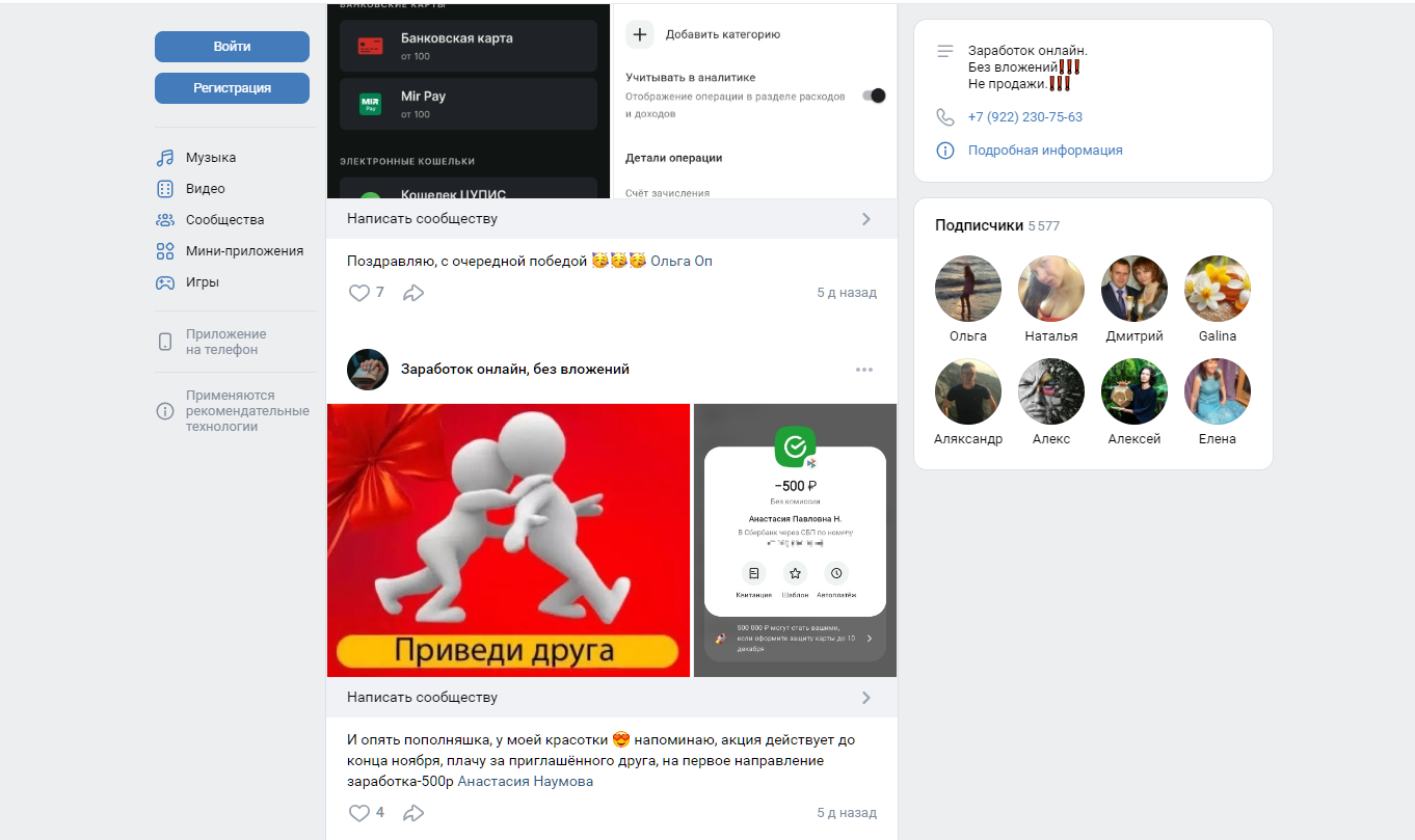 Аферисты максимально шифруются и запутывают следы. Только через поиск «Яндекса» удалось выйти на основной канал этого проекта «Заработок онлайн, без вложений» в VK. На него подписано 5 577 человек.