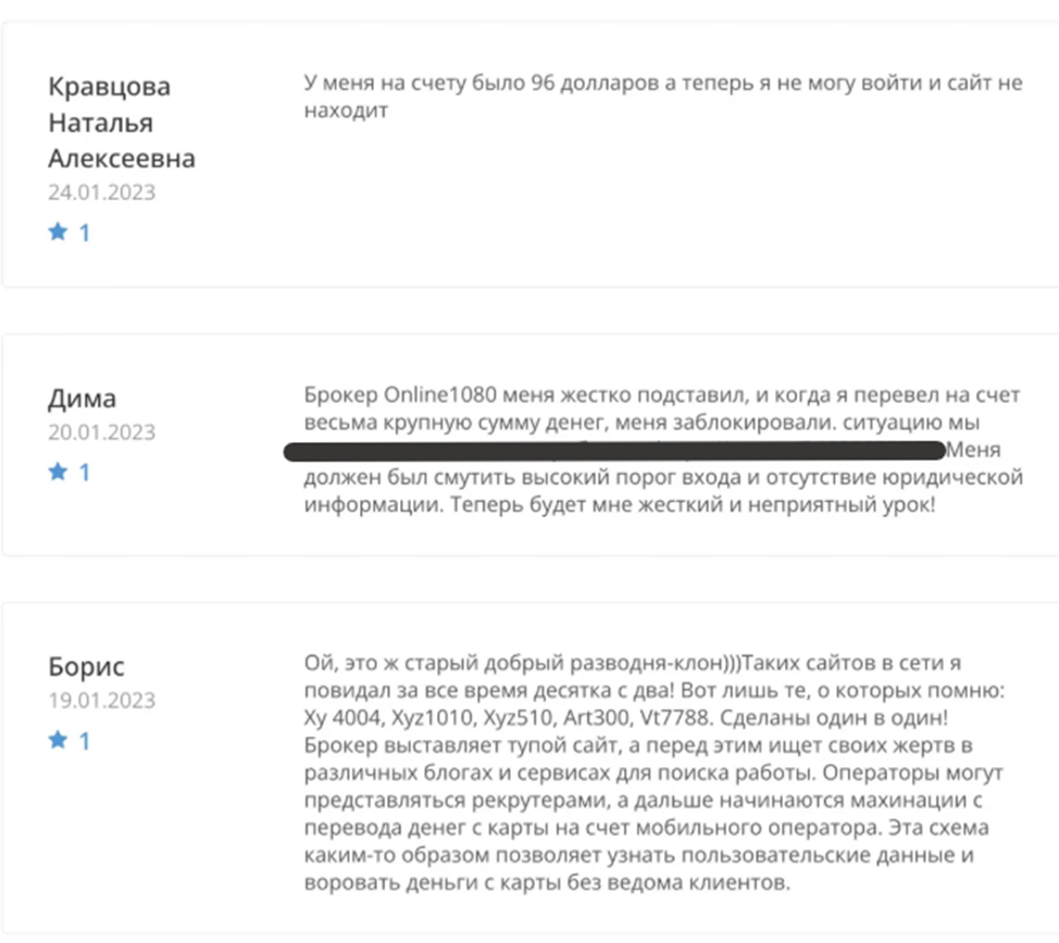 Мы не рекомендуем вкладывать свои средства в Online 1080 Online. Никаких шансов вывести деньги с платформы анонимных посредников или подать на них иск не существует. В паре с ними работают фальшивые юристы, которые обещают помочь с решением проблемы, но занимаются дополнительной выкачкой денег. Если у вас был опыт общения с представителями этих мошенников, то расскажите о нем в комментариях.