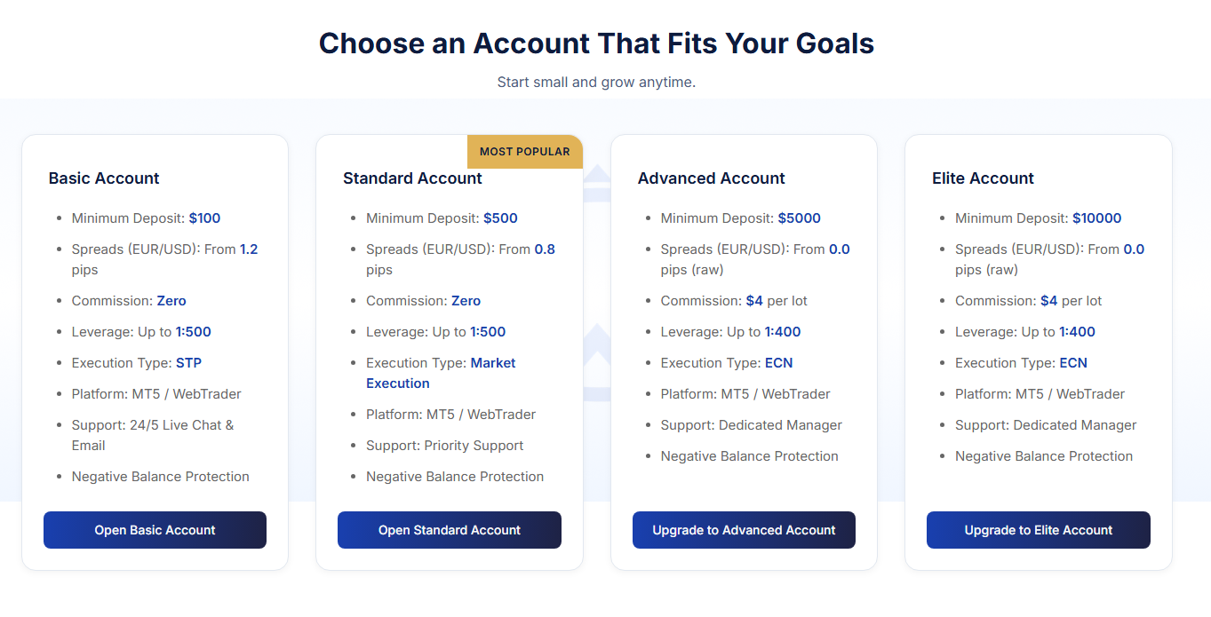 - Elite: депозит от $10 тыс., спреды от 0 пунктов, комиссии — $4 за сделку, кредитное плечо — 1:500.