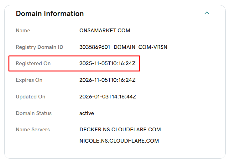 Проверка с помощью WHOIS домена Onsamarket Com показала, что он был зарегистрирован относительно недавно — 5 ноября 2025 года.У компании имеются корпоративные аккаунты в социальных сетях: