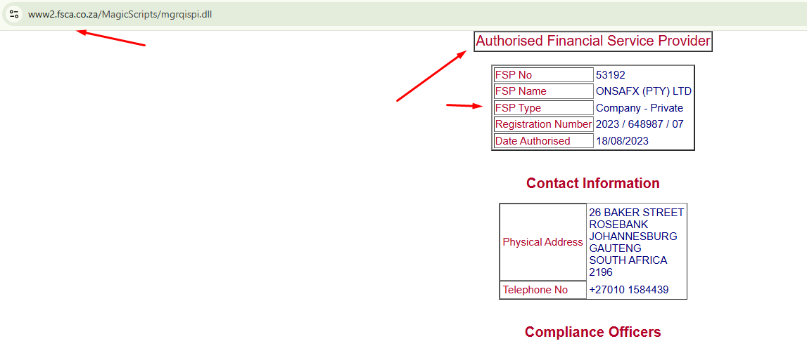 Аккаунты регулярно обновляются и выглядят живыми. Брокер информирует читателей о новостях и обновлениях проекта. Также мы обратили внимание, что на сайте указан юридический адрес и номер телефона. Владельцы сообщают о наличии лицензии FSCA. Мы проверили и выяснили, что Onsa Fx есть в базе регулятора.