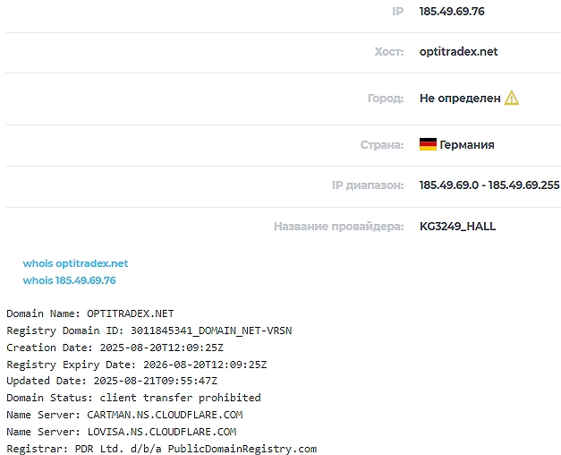 Брокер работает на OptiTradex net — сайте, оформленном 20.08.2025 на неизвестных лиц в Германии. У него есть и ресурс-дублер в доменной зоне .top, но данные об этом с трудом можно найти в Eula.