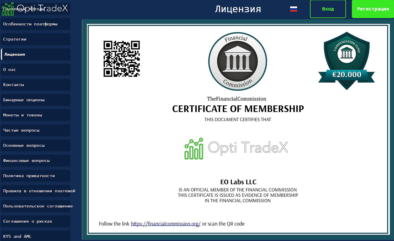 «ОптиТрейдекс» показывает явно поддельную лицензию, которую нельзя верифицировать объективными методами. На скрине упоминают о Eo Labs Llc, и сайт конторы Eolabs net не вызывает доверия.