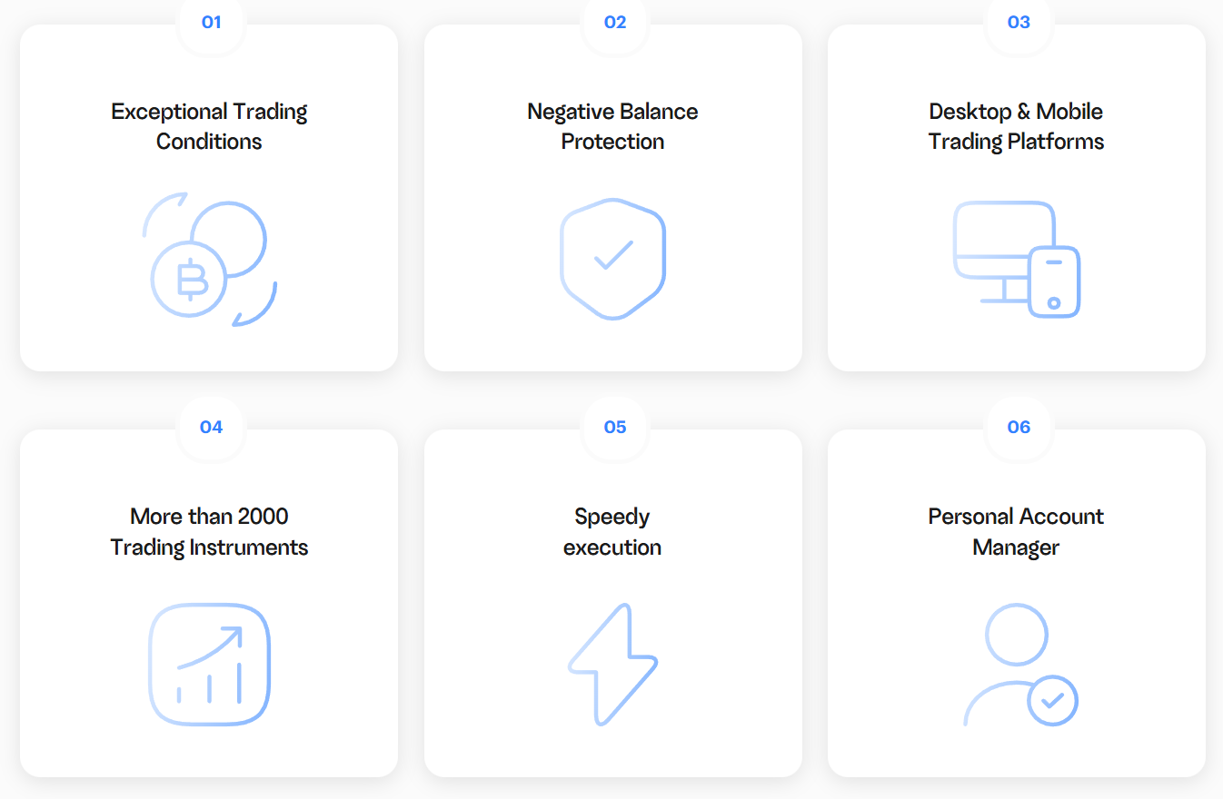 Разработчики заявляют, что на платформе торгуют валютами, товарами, криптовалютами и индексами. Клиенты получают обучение, персонального менеджера, поддержку 24/7. Управлять можно через смартфон или веб-сайт. Из особенностей: мгновенное пополнение счета, быстрый вывод средств, загрузка документов и более 2000 торговых инструментов.
