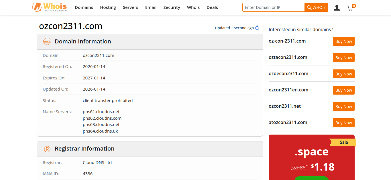 Из доступной информации мы нашли еще дату запуска проекта. Чтобы получить сведения, нам пришлось «пробить» биржу через WHOIS. Старт площадки был 14.01.2026, но судя по уже отсутствующему на 30.01.2026 сайту, платформа просуществовала недолго.
