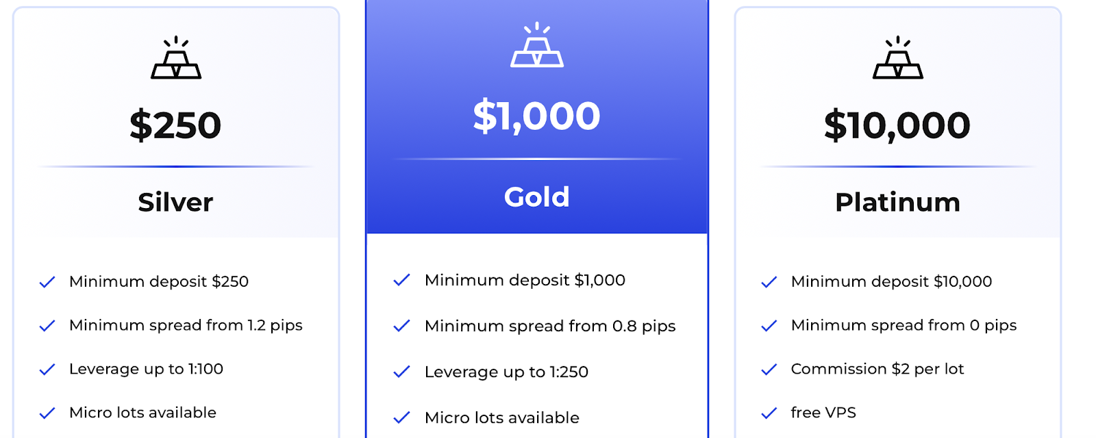 На сайте платформы приведена классификация торговых планов сервиса. Согласно условиям проекта, счета различаются на серебряный, золотой и платиновый. «Серебро» предлагается трейдерам, готовым внести на баланс от $250, тогда как «платина» требует депозите не менее $10 000.