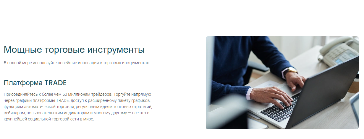 Брокер поддерживает торговлю на пяти рынках: Форекс, акции, крипто CFD, индексы и сырьевые товары. Заключать сделки пользователям предлагают в собственном терминале TRADE.